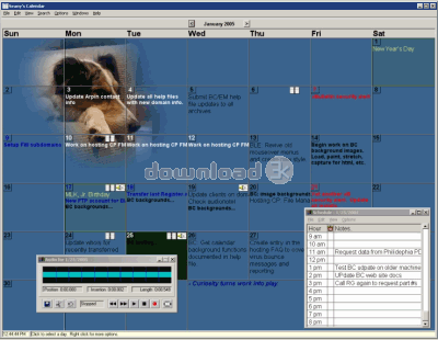 Gardez une trace de vos dates importantes avec A Better Calendar, un outil facile à utiliser programme de calendrier qui ressemble à un calendrier papier de bureau, mais fait beaucoup plus. Fixez notes, les horaires et audio à nimporte quel jour, définir des alarmes pour vous rappeler des tâches importantes, trouver des notes et dates rapide avec la date et les options de recherche de texte, imprimer des calendriers, calendriers et notes, et même poster vos calendriers pour le web. A Better Calendar est spécifiquement conçu pour être simple à utiliser, mais hautement personnalisable, et vous fournit des calendriers visuellement identiques sur votre écran, imprimante ou site web!Si vous voulez garder une trace de votre temps mieux, mais ont été rebutés par la complexité du PIM, A Better Calendar est pour vous! Conçu pour garder trace des dates importantes sans trop deffort, la plupart des fonctionnalités sont à un clic et laide contextuelle est toujours disponible.