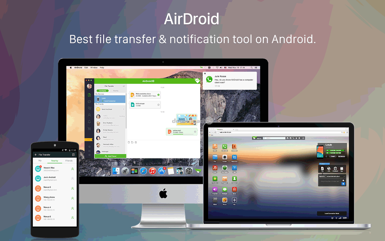 AirDroid vous permet d'accéder et de gérer votre téléphone ou votre tablette Android à partir de Windows, Mac ou du Web, sans fil et gratuitement.Mieux focalisé