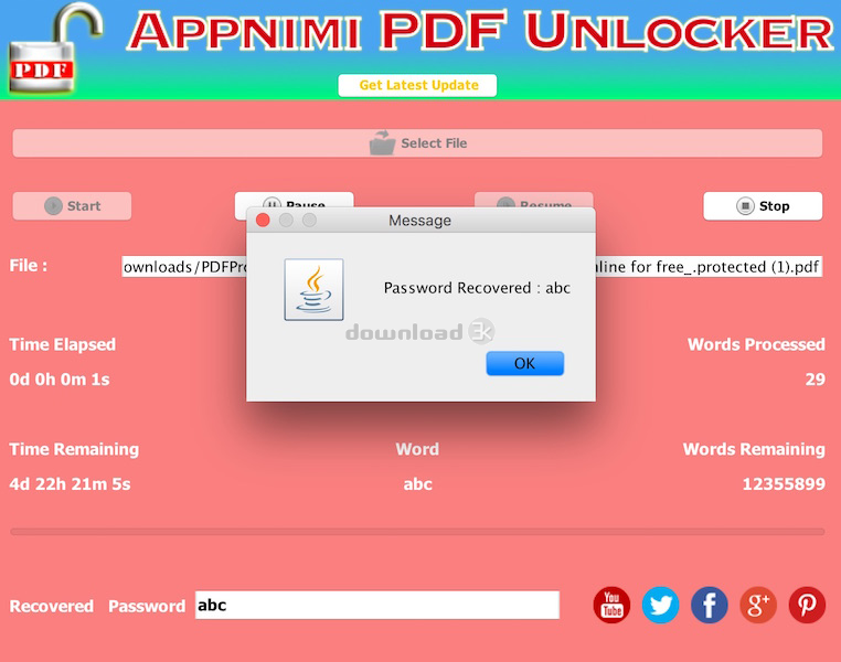 Appnimi PDF Unlocker est conçu pour vous permettre de rechercher des mots de passe de documents PDF protégés. Ce programme garantit la récupération la plus compliquée des mots de passe PDF. Appnimi PDF Unlocker permet de rechercher le mot de passe du PDF protégé en utilisant l'algorithme Brute Force.Il peut être utilisé à la fois par un utilisateur normal ayant oublié son mot de passe ou même par des ingénieurs légistes.