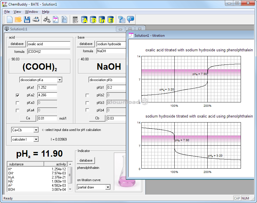 BATE calcule pH des solutions contenant des mélanges dacide et de base avec au maximum 4 étapes de dissociation et de courbes de titrage pour ces acides et les bases. Strentgh ionique peut être calculé à partir des concentrations des formes dissociées, omis ou imposé la solution. Le programme contient modifiable base de données des communes acides et bases faibles et accepte lacide et de base des constantes de dissociation et des constantes de protonation en entrée, le calcul de tous les autres types de constantes, au besoin. Construit en calculatrice permet de calculer facilement les masses molaires et les concentrations pour une formule substance donnée. Imprimés décrivant equlibrium contiennent des informations de concentrations et activties de tous les ions présents dans la solution, conjointement avec les coefficients dactivité (le cas échéant). Impressions titrage contiennent des courbes de titrage pour les deux titrages (acide / base et base / acide) et le pH de tous les points finaux. Un tutoriel exhaustif et de laide. Exigences matérielles très faibles - si votre démarrage de Windows, BATE va fonctionner.Info Antivirus