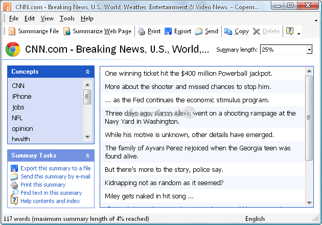 Grâce à notre technologie WebEssence, en attente de brevet, qui supprime automatiquement les textes et le contenu non pertinents (tels que les annonces et les éléments de navigation) des pages Web, Copernic Summarizer se concentre sur les éléments de texte essentiels, ce qui donne des résumés encore plus pertinents.