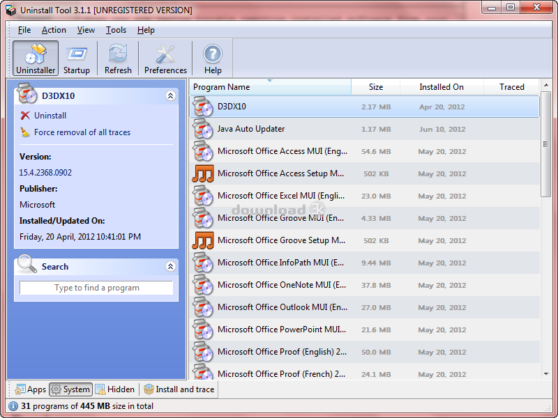Alternative rapide, puissant et fiable pour standard de Windows Ajout / Suppression de programmes. Cest un moyen rapide, sûr et pratique pour supprimer des applications inutiles et daméliorer lefficacité de votre ordinateur.Vous pouvez facilement parcourir votre logiciel à laide de trois catégories dapplications (logiciel, système et caché.) Une recherche rapide entité vous permet de trouver rapidement nimporte quelle application vous avez besoin. Suppression de programmes qui ne peuvent être enlevés par Ajout / Suppression de programmes! Outil de désinstallation supprime également les programmes qui sexécutent automatiquement, au démarrage du système - une excellente option pour obtenir un contrôle complet sur votre ordinateur.