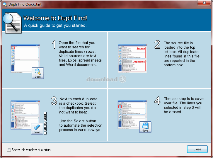 Dupli Find est un utilitaire qui permet de localiser en double lignes / rangées dans des fichiers texte, des tableurs Excel et des documents Word. Doublons trouvés sont présentés visuellement et peuvent facilement être retirés de la source avec un minumim de travail requis. Le filtrage peut être utilisé pour identifier des parties spécifiques des lignes pour de meilleurs résultats. Dupli Trouver peut également être utilisé comme un utilitaire de texte général qui fournit de nombreuses fonctions pour manipuler des fichiers texte.Caractéristiques: