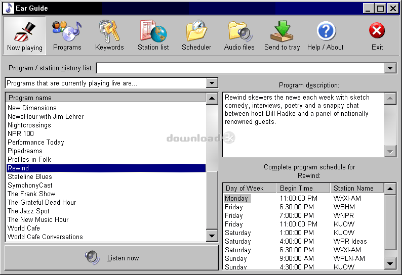 Découvrez le monde de la radio publique avec le Guide oreille! La radio publique est sans publicité, de lauditeur de la radiodiffusion publique soutenue. Vous pourriez être assez chanceux pour vivre dans une région du pays où vous pouvez allumer votre radio et écouter des programmes de NPR et PRI, comme All Things Considered, A Prairie Home Companion, et Car Talk, pour nen nommer que quelques-uns. Mais que faire si vous nêtes pas près dune radio? Ou si vous avez raté lépisode de cette semaine de This American Life? Ou si la radio publique nest pas disponible dans votre région? Les bonnes nouvelles sont que la radio publique est également disponible sur Internet! Des centaines de commerciaux uniques, libres, émissions de radio publiques sont à votre disposition si vous avez une connexion Internet assez rapide, un joueur de transmission multimédia en continu (RealAudio, Winamp, etc) et le Guide de loreille! Guide oreille est semblable à la revue TV Guide populaire - mais au lieu de programmes de télévision, loreille Guide répertorie des centaines de stations de radio populaires et des programmes publics que vous pouvez écouter pour le clic dun bouton de la souris. Oreille Guide a plus de 400 programmes de radio différentes cotées en bourse, de plus de 100 différentes stations de radio publiques. En plus découter des émissions en direct de radio publiques, Ear Guide a aussi une bibliothèque darchives audio que vous pouvez écouter à tout moment. Si vous êtes un fan de la radio publique, puis loreille Guide est un "must have" plus de votre collection de logiciels!Info Antivirus