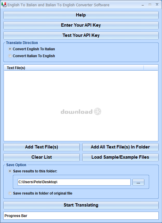 Ce logiciel offre une solution pour les utilisateurs qui souhaitent traduire l'anglais en italien et inversement. Le texte peut être chargé à partir d'un fichier et la paire de traduction (anglais vers italien ou italien vers anglais) est sélectionnée dans le menu déroulant. Les résultats sont affichés dans le volet inférieur et peuvent être copiés dans le Presse-papiers pour être collés. Ce logiciel utilise Google Translate comme colonne vertébrale pour les traductions et nécessite une clé API Google Translate. Les instructions pour obtenir une clé se trouvent dans le logiciel.Exigences: None