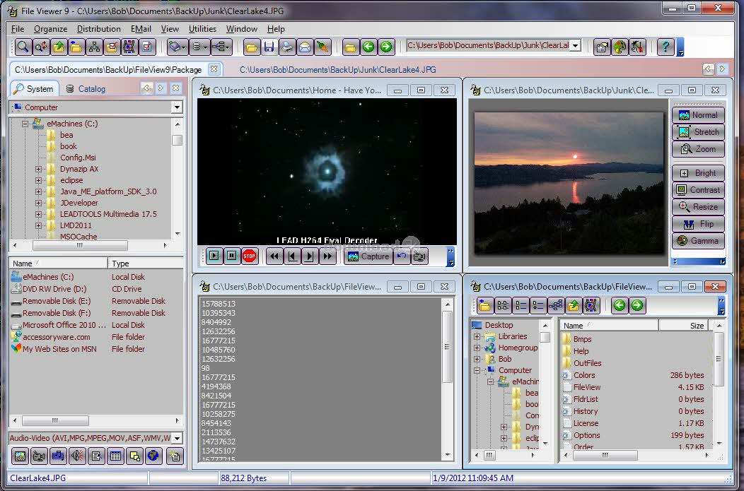 File Viewer est un programme de gestion but Disk / fichier multi avec des fonctions pour trouver, la visualisation, limpression, envoi par courrier électronique, et lorganisation de photos, images, textes, documents, bases de données, et la propagation feuille de fichiers. Fichiers multimédia, y compris MP3, AVI, MPG, MP4, FLV, MOV, WMF, WMA, MID, RMI, et WAV, sont facilement localisé, joué et organisé en utilisant File Viewer. Listes de lecture séparées sont disponibles pour la musique et des fichiers vidéo. Montage image comme flip, Rotation, Redimensionner, Recadrer, Luminosité, Couleur et Hue. Appliquer la modification à limage entière ou dune région de limage. Organiser les fichiers sur un réseau local dans la base de données par type et recherche mot avec des descriptions et des commentaires pour chaque fichier. Trouvez et fichiers Zip Décompressez. Les fichiers du package dans un fichier Zip pour envoyer par e-mail sur Internet. Great Utilites de fichier incluent copier, supprimer, renommer, déplacer. Les fichiers peuvent être gérés individuellement ou plusieurs fichiers sélectionnés pour la gestion des disques de lot. Batch Copier des fichiers RW CD Rom, Zip, ou un autre ordinateur sur le réseau. Afficher et Imprimer Base de données des fichiers par index. Voir les photos et les fichiers multimédia sur Internet. Organisez votre disque entier par catagories tels que des images, documents, textes, bases de données, feuilles de calcul, etc. Créer vos propres groupes de fichiers en ajoutant des descriptions, des mots de recherche et des commentaires pour chaque fichier. Organiser les fichiers accessibles sur le réseau local. Afficher les fichiers dans lOrganiseur selon la taille du fichier et la date de modification. Aide Texte complet avec des conseils rapides et couleurs définies pour File Viewer Windows et Composants de la fenêtre. Support client FTP. Plusieurs fenêtres de Windows Explorer comme. Exécutez plusieurs catalogues pour des disques, des dispositifs, des dossiers de sélection des fichiers par type de fichier ou des combinaisons de types de fichiers. File Viewer Express amène File Viewer dans le futur avec des versions pour Windows, Macintosh et Android.Exigences: 128 Mb RAM, 100 Mb Free Disk Space, VGA, Super VGA, or XGA monitor