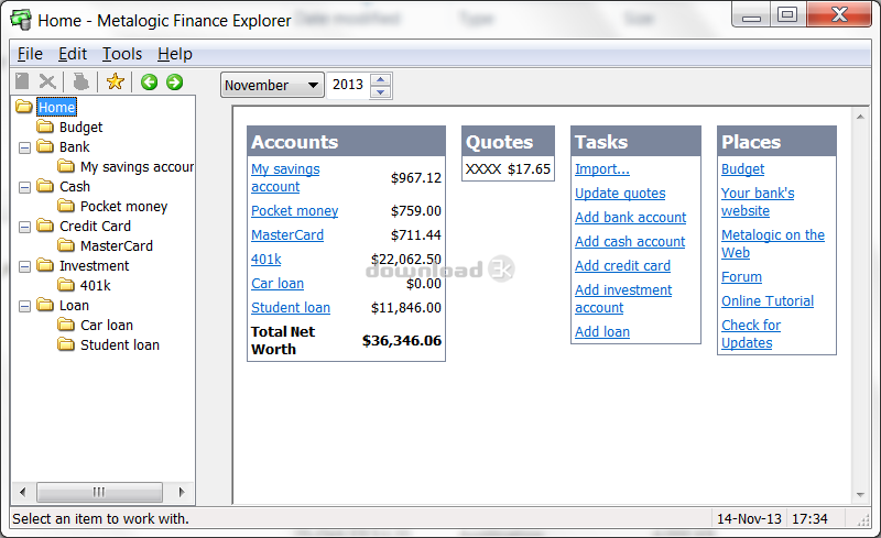 Logiciel de finances personnelles compatible avec Microsoft Money et Quicken téléchargements de sorte que vous pouvez importer vos transactions à partir de presque nimporte quelle banque (prend en charge: formats OFX, QIF et OFC). Pas besoin dentrer manuellement. Comprend un budget intuitive. Poignées et un nombre illimité de comptes, y compris le contrôle, lépargne, linvestissement, argent comptant, carte de crédit et de prêt. Vue mensuelle des transactions ainsi que vue de la valeur nette. Télécharger des cotations boursières à partir du Web. Didacticiel en ligne et pour couronner le tout, une interface conviviale de style Explorateur Windows de lutilisateur même. Les autres caractéristiques comprennent limpression et lexportation.Quoi de neuf dans cette version: Tooltips on budget will show whether the grid is focused or not. Budget totals are in the group header as to take one less line per group.