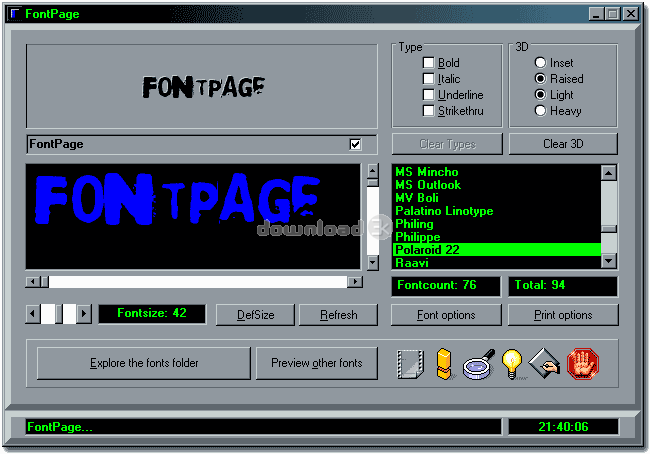 FontPage vous permet d'examiner et de comparer toutes les polices de votre système. Vous pouvez visualiser n’importe quel type de caractère en gras, italique, souligné et aussi en 3D. En outre, vous pouvez également comparer deux polices sélectionnées et des polices d'aperçu qui ne sont pas encore installées sur votre système. FontPage peut également imprimer un exemple de page pour les polices sélectionnées ou imprimer une liste de toutes les polices installées.Quoi de neuf dans cette version: New: FontPage is Windows Vista compatible now. Also fixed a bug that was caused by a conflict with another program.