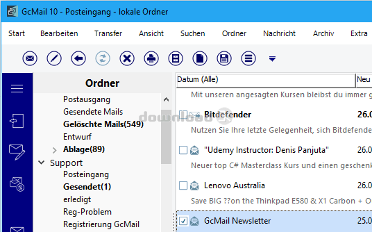 GcMail est un Mailclient très flexible qui offre une grande variété d’options de configuration, tout en étant facile à utiliser.GcMail est un programme qui convient à l’utilisateur occasionnel, ainsi qu’au Power User. dans un environnement de bureau. La disposition claire, la facilité d'utilisation et la sécurité étaient des priorités dans le développement du programme. En matière de sécurité, GcMail excelle. Vous pouvez utiliser l'option de chiffrement intégrée de GcMail si le destinataire utilise également GcMail. Vous pouvez également chiffrer vos messages confidentiels avec PGP. * Nombre d'utilisateurs illimité * Nombre de comptes illimité * Recherche étendue * Règles de filtrage étendues avec assistant * Signatures et modules de texte * Dossiers d'archives privés étendus * Réception sans surveillance * Cryptage / décryptage des messages (à l'aide de PGP) * Suppression des messages sur le serveur * Général et privé carnets d'adresses * Affichage et verrouillage des robots Web * Fonctions de sauvegarde étendues * Réception d'en-têtes avec certaines lignes de message * Installation rapide pour créer des comptes * Cryptage APOP Connect * Cryptage SSL Connect * Envoi de courrier en annexe * Vérification orthographique automatique * Flux RSS Atom * Styles XP (Office 2003) pour Win2000 / WinXP * USB_Stick Copie du dossier de l'ordinateur hôte * Protocole POP3 et imap * Filtre anti-spam intégréExigences: 256 MB