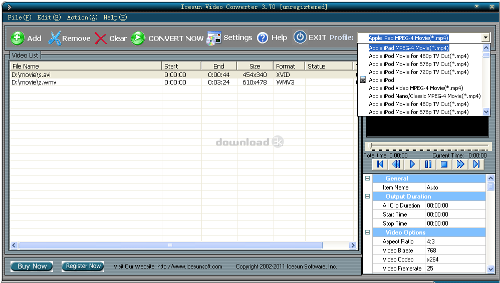 Icesun Video Converter est un convertisseur vidéo professionnel, il peut convertir des fichiers vidéo à partir de différents formats avec une grande stabilité. Il supporte la conversion de la plupart des formats vidéo, y compris AVI, WMV, ASF, DVR-MS, MS-DVR, MOV, MP4, 3GP, 3G2, QT, RM, RMVB, FLV, MKV, AVS, M2TS, MPG, VOB, DV, M1V , M2V, DAT, AMV, DIVX, M4V, MPE, MPV, OGM, FLV et le format de fichier SWF. Il peut également extraire laudio des fichiers vidéo. Une interface facile à utiliser vous permet de profiter de travailler avec des fichiers vidéo sans consulter fréquemment des matériaux de référence. Vous pouvez convertir plusieurs fichiers en lots indépendamment de leurs formats de source.Caractéristiques Icesun Video Converter comprennent: