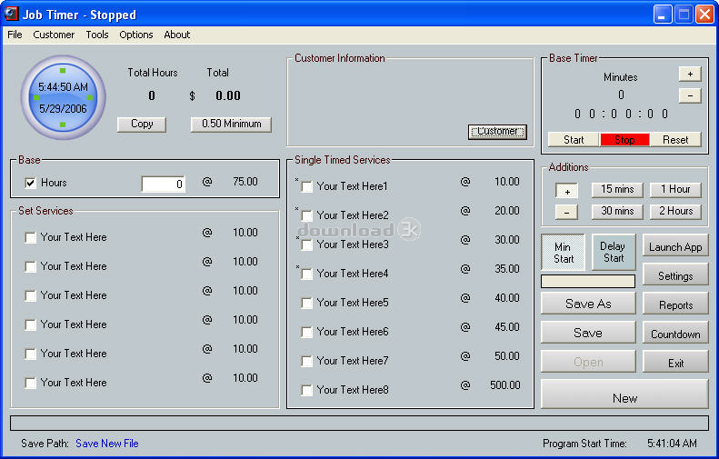 Juste un petit Time Keeper pour garder trace du temps passé sur une tâche. Il vous aide également à déterminer le coût et a construit dans la facture. Informations magasins à la clientèle. Vous pouvez littéralement toucher début, puis quand votre fait imprimer une facture. Vous avez également une section pour les services temporisés. Cela vous permettra de garder une trace du temps sur les différents services, y compris leurs prix. Vous avez la possibilité dajouter jusquà plus dun service. Comprend un compte à rebours, un comte Up Timer, Alarme, Pause Alarmes, ergonomique entité. Vous pouvez afficher les rapports de projet, des rapports quotidiens, hebdomadaires ou mensuels Rapports sur les emplois que vous avez travaillé, plus vous pouvez gérer vos factures, la recherche par le client ou le travail et voir comment beaucoup a été fait pour ce client ou dun emploi. Pistes vos factures et vous permet de savoir quand ils sont dus. Times, crée, gère, Rapports tous les aspects de votre projet. Télécharger et Découvrez cette nouvelle version de travail du minuteur. Vous verrez que ce sera un grand atout pour votre journée de travail.Exigences: 1500mhz Processor 512mb RAM