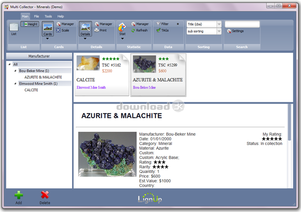 LignUp multi Collector est un outil universel pour la gestion de nombreuses collections avec des objets de collection. Il comprend de nombreuses fonctions comme la création de base de données de collection personnalisée; capturer des images de la caméra Web, obtenir des images en ligne, corriger les images dans léditeur graphique, modifier diverses catégories; protection par mot de passe; génération de rapport en tant que document PDF et le site HTML; filtres intelligents et tri de données.gestionnaire de base de données permet de commuter facilement entre les différentes collections.