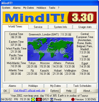 Organisateur multimédia avec radio-réveil parlant, 8 alarmes et 8 horaires de travail, la synchronisation automatique de lheure atomique, le soutien InternetTime Swatch, les fêtes et célébrations de rappel avec la base de données actualisable via Internet, un simple clic daccéder aux outils système et des fonctionnalités cachées, mot de passe révélant cachette \, CTRL- ALT-SUPPR blocage, un arrêt du système clic, le redémarrage ou lhibernation et beaucoup plus ...Exigences: Win98 or higher