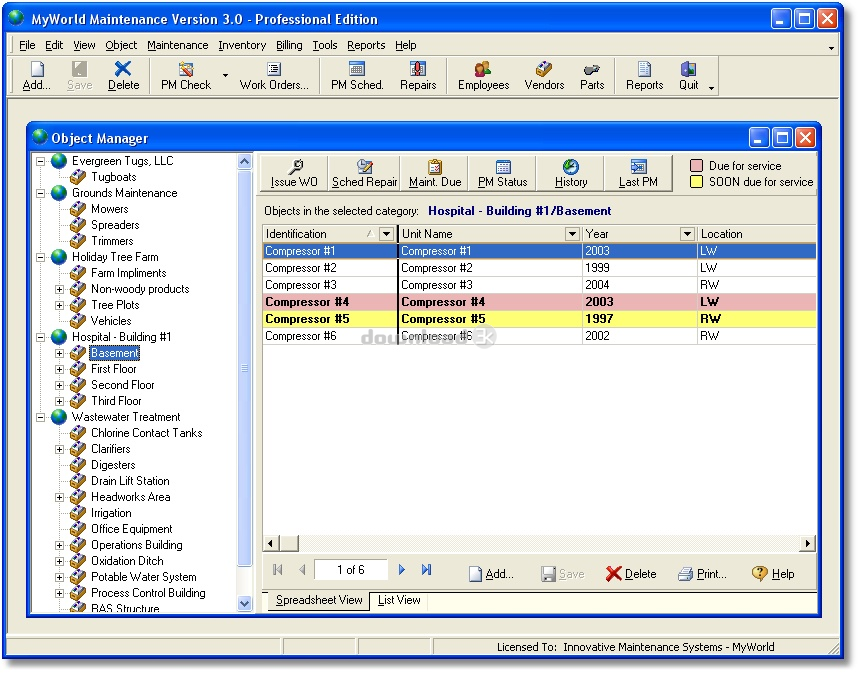 MyWorld Maintenance est un système flexible de logiciel de maintenance qui vous aidera à garder une trace de maintenance préventive et curative sur tout type dobjet. Il est suffisamment souple pour suivre quelque chose de lentretien des installations de copier machines et à peu près tout ce que vous pouvez imaginer doù le terme «entretien de MyWorld". MyWorld Maintenance vous permet de garder une trace dun nombre illimité dobjets qui peuvent être organisées en catégories. Vous pouvez suivre les informations détaillées spécifiques à un objet en utilisant les nombreux champs définis par lutilisateur fournis pour chaque objet.MyWorld Maintenance vous permet de définir vos propres horaires PM pour vos différents types dobjets. Chaque tâche PM peut être configuré différemment pour être suivis par date ou par «parts» qui est un terme générique qui peut être défini comme miles, kilomètres, des heures, des copies, des révolutions, ou tout ce que vous pouvez imaginer. La configuration est simple, vous permettant de définir lintervalle de répétition ou les paramètres dexpiration fixe pour chaque tâche PM. Notification dentretien grâce est un processus entièrement automatisé qui utilise un code couleur des indicateurs sur lécran principal. Les objets qui sont dues pour les services sont ombrés de couleur rouge et les objets qui sont bientôt exigibles pour le service sont ombragés dune couleur jaune. Vous pouvez voir instantanément les objets qui nécessitent une attention et qui ne le font pas. Lorsque lentretien est enregistré dans le système, une histoire maintenance préventive et corrective est généré automatiquement en détail tous les travaux dentretien effectués sur lobjet et les coûts. Lhistoire dentretien est utilisé pour générer des rapports détaillés danalyse des coûts et peut être utilisé pour surveiller les tendances de négligence, dabus, ou tout simplement léquipement vieillissant. Une base de données des fournisseurs, base de données des parties, et base de données des employés est également inclus. MyWorld Maintenance est un logiciel riche en fonctionnalités qui est facile à utiliser et abordable. A Professional Edition est également disponible qui ajoute la gestion des travaux de commande, suivi de linventaire des pièces, suivi de commande, et plus encore. Consultez notre site Web (http://www.mtcpro.com) pour plus de détails.
