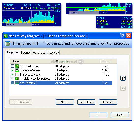 Le programme vous permet de surveiller et de contrôler le trafic de votre réseau. Visualiser votre activité sur Internet est simple - le programme est facile, même pour les utilisateurs inexpérimentés. Vous pouvez afficher toutes les connexions établies, le trafic du réseau de surveillance sur une certaine période, les notifications de configuration différents, etc Utilisez les icônes de plateau et des diagrammes flottants pour voir le flux du réseau octets. Diagramme dactivité net pouvez afficher votre activité sur le réseau dans des fenêtres flottantes et icônes de la barre. Vous pouvez ajuster les couleurs, les tailles de police et de la transparence en fonction de votre thème de bureau favori. Contrôler et surveiller votre trafic. La nouvelle version introduit une fonctionnalité unique et fiable Smart Filtering pour surveiller le trafic réseau par les protocoles Internet. Contrairement aux moniteurs dautres réseaux, des diagrammes dactivités net analyse les connexions Internet de façon indépendante par le numéro de port, vous permettant de voir le Web, FTP, streaming media et dautres activités séparément. Le programme possède de riches capacités statistiques pour surveiller le trafic pour une période de temps spécifiée. Vous pouvez filtrer le trafic par type de connexion, adresse IP, port et dautres paramètres. La boîte de dialogue Connexions actives montre toutes les connexions établies avec dautres ordinateurs et la quantité dinformations traversé chacun. Soyez averti lorsque votre trafic dépasse vos limites prédéfinies. Le système de notification flexible vous permet de fixer des limites sur les paramètres de trafic divers. Si vous dépassez ces limites, vous en serez informé par e-mail, net send, boîte de message, des sons ou un lancement de lapplication, selon votre choix. Obtenez des informations instantanées sur la force du signal Wi-Fi. Wi-Fi les utilisateurs comme lindicateur de puissance du signal dans la barre système. Cette fonction permet de trouver lendroit où votre connexion sans fil est le plus rapide et plus fiable.Exigences: CPU:486 or higher,Memory: Minimum to run Windows 9x/NT/ME/2000, Disk Space: 400k