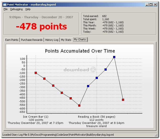 Point Motivator est un programme qui vous permet de configurer (ou de partager des configurations) des éléments qui vous rapportent des points. Vous décidez quelles activités vous rapportent combien de points. En traçant votre progression dans le temps et en vous offrant un moyen facile de consigner vos activités et de gagner des points, vous êtes motivé pour agir de manière productive. Vous pouvez même configurer des récompenses que vous pouvez acheter avec vos points gagnés.Info Antivirus