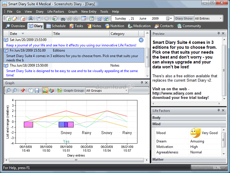 Smart Diary Suite gratuit est à la fois - logiciel agenda et un gestionnaire dinformations personnelles complètes (PIM ou logiciel dorganisateur) qui comprend un journal, le calendrier et les tâches. La fonction Diary utilise des facteurs de vie uniques qui vous permettent de voir comment les différents aspects de votre vie affectent votre santé et votre bonheur en les reportant sur un graphique. Vous pouvez voir comment votre exercice affecte votre humeur, voir des jours où vous vous sentez mieux ou vérifier votre pression artérielle sur les jours de pluie. Ils sont complètement flexibles et vous pouvez créer vos propres ou télécharger des packs de facteur supplémentaire de la vie plus tard. Vous pouvez être aussi complexe ou aussi simple que vous sentez à laise lors de lutilisation des facteurs de vie - vous êtes toujours en contrôle. Lannexe fournit un planificateur pleinement fonctionnel pour garder une trace de vos rendez-vous avec un rappel que vous pouvez même e-mail, de sorte que vous ne manquerez jamais cet événement important. Tâches vous permettent de définir des objectifs et à garder une trace de leur achèvement. Restez au top de votre vie! Il ya beaucoup plus de fonctionnalités, alors nhésitez pas à explorer et de profiter de laide SDS. Essayez-le dès aujourdhui!Exigences: No special requirements