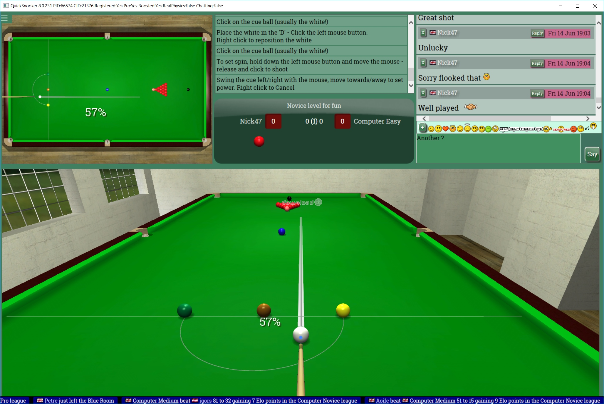 QuickSnooker est la simulation de snooker la plus réaliste et la plus complète sur Internet.C'est le seul jeu de Snooker pouvant être joué en 3D, 2D ou les deux à la fois!