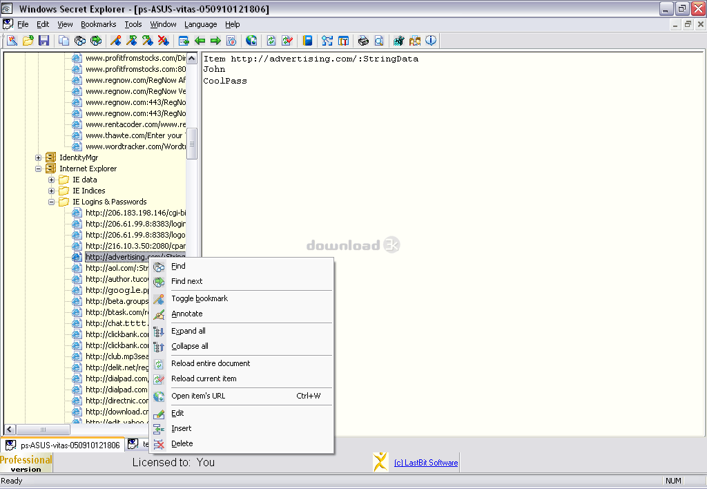 Trouver des données cachées, comme les données dauto-complétion IE forme (y compris les logins et mots de passe), récupérer les mots de passe Internet (mots de passe différents vers des sites protégés, compte e-mail et mot de passe didentité), et bien plus encore avec cet outil dinspection du nouveau système. Secret Explorer est conçu pour parcourir, analyser et modifier les données cachées qui sont stockées dans Windows Storage sans-papiers protégée. Avec Secret Explorer import / export, vous pouvez également déplacer toutes vos informations personnalisées à partir dun ordinateur à lautre, essentiellement familiariser un nouveau système avec vous.Exigences: MFC v4.2 runtime