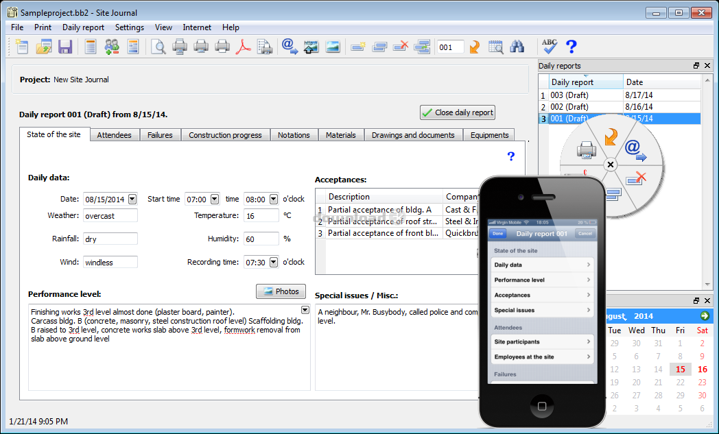 Documentation complète: Les éléments de journal suivants sont traités comme une liste de contrôle, de sorte qu'aucune entrée importante ne soit oubliée: météo, occupation du site, journée de travail de chaque entreprise, statut des performances (texte, photos), défauts (texte, photos), retards, obstructions , Processus de réception, Instructions données aux entreprises, Tests et mesures, Livraisons de matériaux de construction, Livraisons planifiées, Équipements et machines.