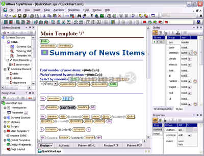 Altova StyleVision Enterprise Edition est un puissant concepteur visuel de feuilles de style et de rapports permettant de transformer des données XML, XBRL et de bases de données en sorties HTML, RTF, PDF, OOXML / Word 2007 et eForm. Il est conforme aux normes et prend en charge XSLT 1.0, 2.0 et 3.0, XSL: FO, CSS, JavaScript et toutes les bases de données principales. En une étape simple, vous pouvez accéder aux données XML, XBRL et / ou de base de données, les traiter et les restituer dans 5 formats de sortie différents. Vous pouvez même générer une application Web ASPX entièrement fonctionnelle. StyleVision possède un éditeur de script puissant et des API Java et COM. Il comprend un importateur HTML intégré qui convertit une page Web en un fichier XML, une feuille de style XSLT et un schéma XML. En outre, des assistants vous aideront à concevoir de manière dynamique des feuilles de style pour les rapports financiers, notamment les graphiques de XBRL. Vous pouvez concevoir et construire des modèles à utiliser avec Authentic, l'éditeur WYSIWYG XML et le contenu de la base de données Altova. Les formulaires authentiques permettent aux utilisateurs d'accéder et de modifier directement des documents XML et / ou des bases de données sans être exposés à la syntaxe XML. Créez une sortie de présentation dans un modèle de flux de documents ou de présentation. Vous pouvez même télécharger une image de plan directeur à utiliser comme guide pour votre modèle de conception. Le code de sortie ou XSL peut être visualisé à tout moment. Les feuilles de style peuvent être basées sur des schémas XML, des DTD, des taxonomies XBRL, des structures de base de données ou même des fichiers XSLT existants, et prennent en charge la validation de la logique métier, la création de graphiques, les tableaux complexes, les tableaux HTML / CALS, les codes à contenu, le formatage conditionnel, le filtrage direct par modèle , contrôle de la date, signatures numériques XML, etc. Le déploiement n'a jamais été aussi simple: XML, les schémas et tous les éléments de conception peuvent être répartis dans un seul fichier PXF (Portable XML Form). StyleVision est disponible en versions 32 bits et 64 bits et s'intègre de manière transparente à Visual Studio et à Eclipse. Altova StyleVision est l'outil ultime pour la publication multicanal à source unique. Concevez avec style! Téléchargez une version d'essai gratuite de StyleVision Enterprise Edition sur www.altova.com.Quoi de neuf dans cette version: Bug fixes and other enhancements