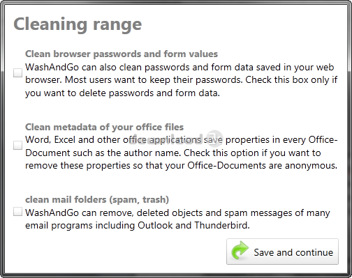 WashAndGo indique ses utilisateurs combien d'espace disque a été libéré, ainsi que les avantages de l'exécution du programme peuvent être vus immédiatement à. Un clic de souris unique commence WashAndGo examine le disque dur. Les utilisateurs puis examiner une liste de fichiers détectés ordures et autorisent WashAndGo pour les supprimer. Les utilisateurs qui préfèrent être prudents peuvent basculer sur l'option de sécurité de WashAndGo afin de permettre la récupération, si besoin est, de tous les fichiers supprimés jusqu'à 14 jours après le nettoyage de.