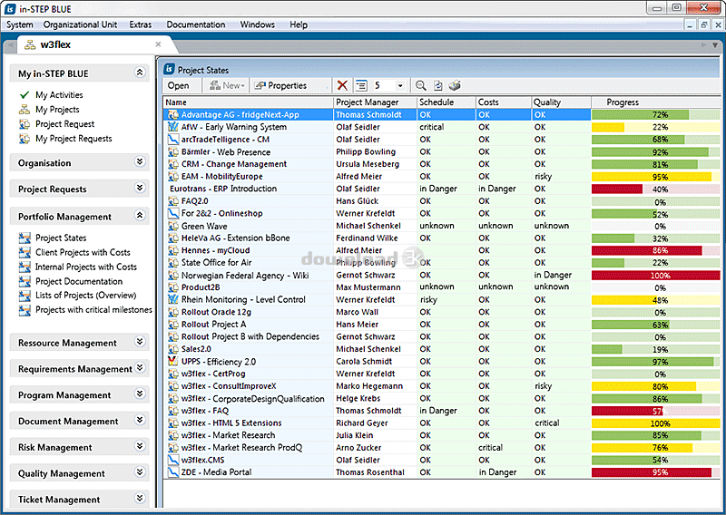Le logiciel de gestion de projet in-STEP BLUE prend en charge les équipes en fournissant des processus métier puissants, des flux de travail et des modèles personnalisables, ainsi qu'une version incluse des documents, des exigences, des modifications, etc. La conception individuelle d'un processus métier dépend de l'environnement dans lequel vous travaillez, que ce soit l'aviation, l'industrie ferroviaire, l'automobile, la technologie médicale, le développement de logiciels informatiques ou le développement de produits pour les systèmes embarqués. Les processus de gestion que vous utilisez et les départements, rôles et opérations que vous soutenez sont entièrement à vous. Utilisez un processus individuel pour la gestion de projet à l'échelle de l'entreprise, utilisez des normes telles que V-Modell XT, PRINCE2, agile Scrum ou SPICE for Automotive. Ou créez simplement votre propre flux de travail pour la documentation de votre projet. Planifiez vos projets avec le logiciel de gestion de projet in-STEP BLUE et atteignez vos objectifs.Projets et portefeuilles, équipes et organisations, chefs de projet, analystes des exigences et testeurs ont tous un point commun: ils ont besoin d’une infrastructure commune pour réussir. in-STEP BLUE crée cette infrastructure pour vous. Dans de nombreux cas, la gestion de projet se concentre uniquement sur les dates et les coûts. Mais comment créez-vous un contenu de projet précieux et des produits de haute qualité? in-STEP BLUE vous permet d'utiliser vos propres méthodes établies de gestion des documents, des modifications, des exigences, des risques, des scénarios de test et bien plus encore. Avec des informations à jour pour la planification et le contrôle de projet disponibles à tout moment. Les valeurs et le contenu réels sont mis à jour automatiquement par chaque membre de l’équipe et gérés par révision sécurisée. La collaboration au sein de vos projets est améliorée, permettant un travail de projet plus efficace.
